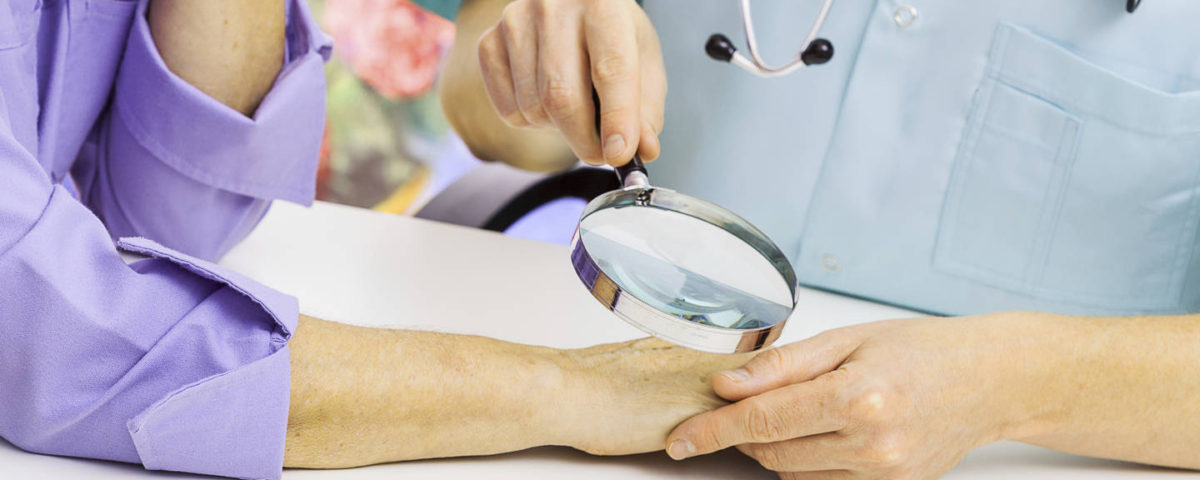 Dermatologist looking at woman's hand through a magnifying glass